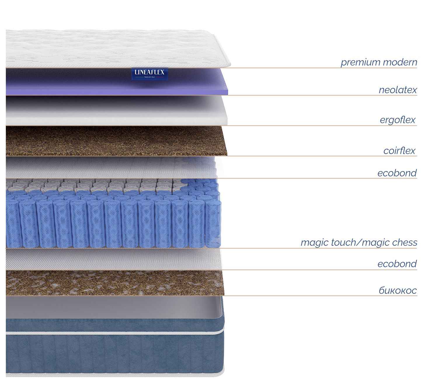 Coirflex (1 см) – комфортный слой из натуральной кокосовой койры, пропитанный натуральным латексом (50% волокно кокосового ореха, 50% латекса). Гибкий и упругий, обладает ортопедическим эффектом и устойчив к нагрузкам. Придаёт жесткость матрасу