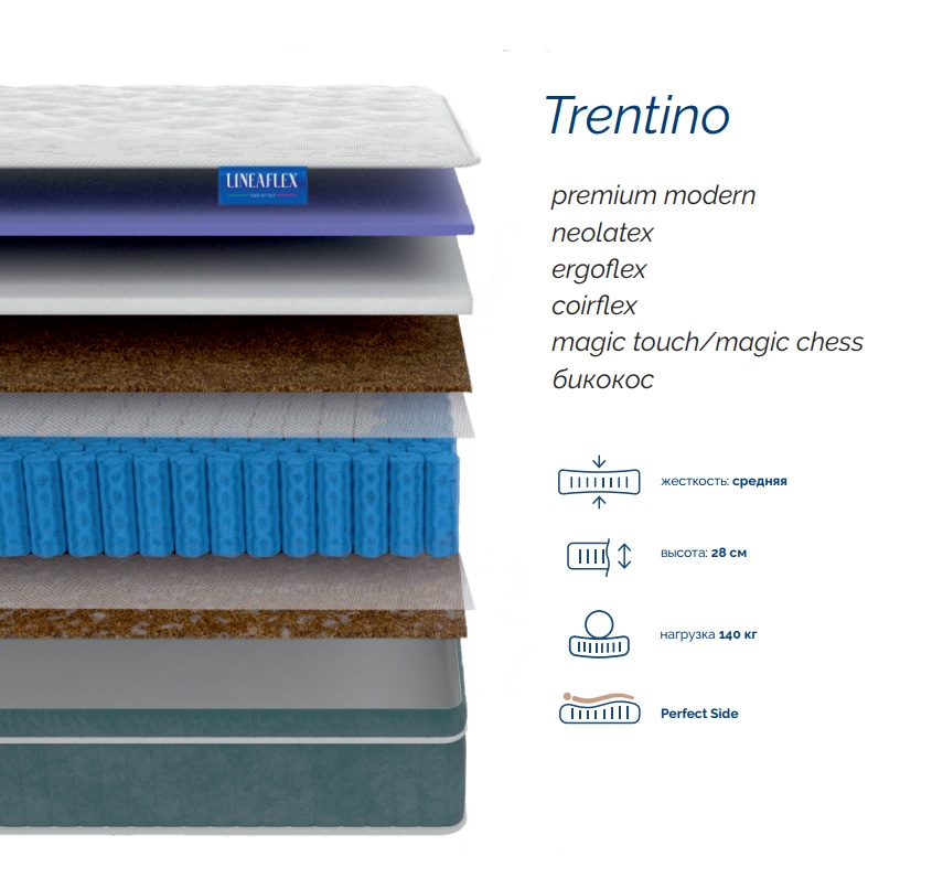 • Линейка включает в себя 4 матраса высотой 28 см и разной жесткости