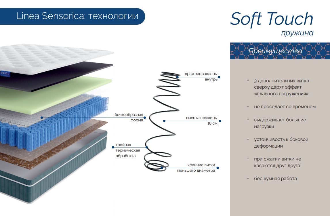 • Все матрасы линейки односторонние за счет использования современных и инновационных комфортных слоев и несущей системы Magic Touch (420 пружин на спальное место), в основе которой пружина Soft Touch с микромассажным равномерным распределение нагрузки