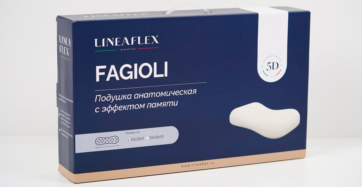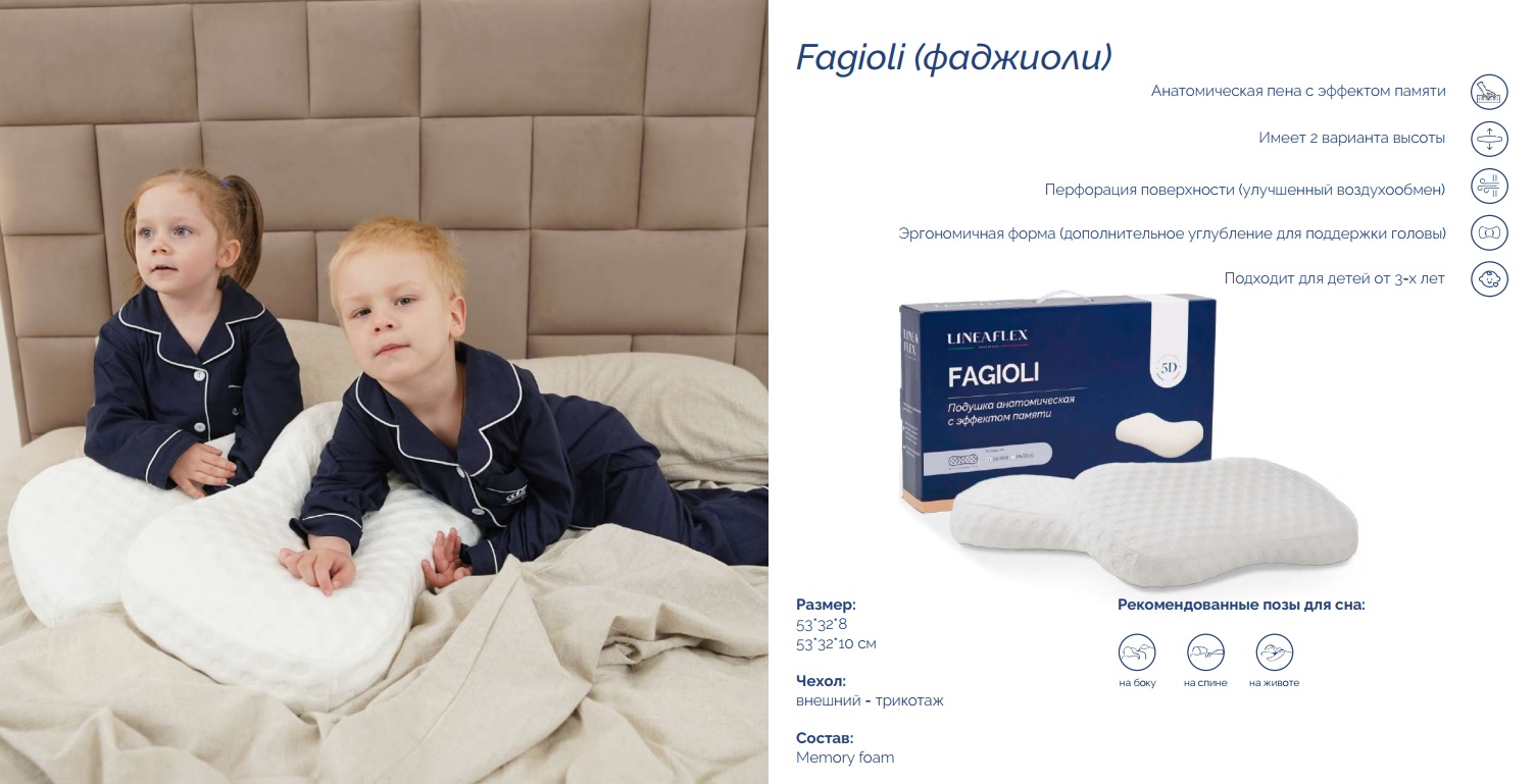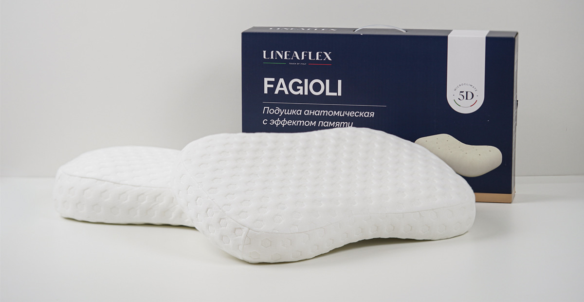 Подушка Fagioli сочетает в себе эргономичную форму и премиальную пену с эффектом памяти. Точечно, без ответного давления, подстраиваются под голову и шею спящего, даря максимальное расслабление.