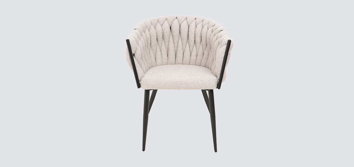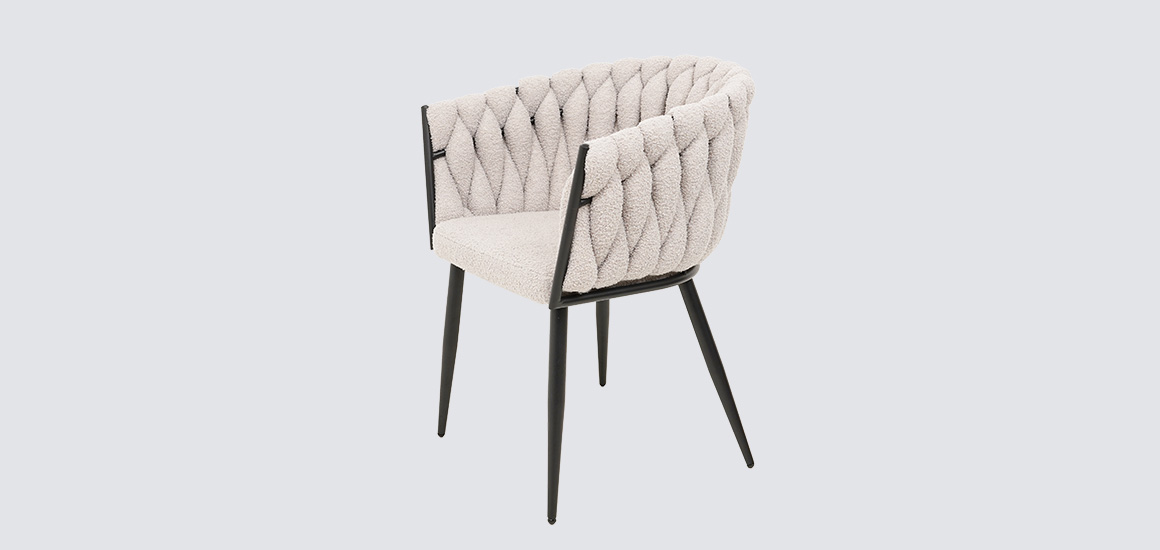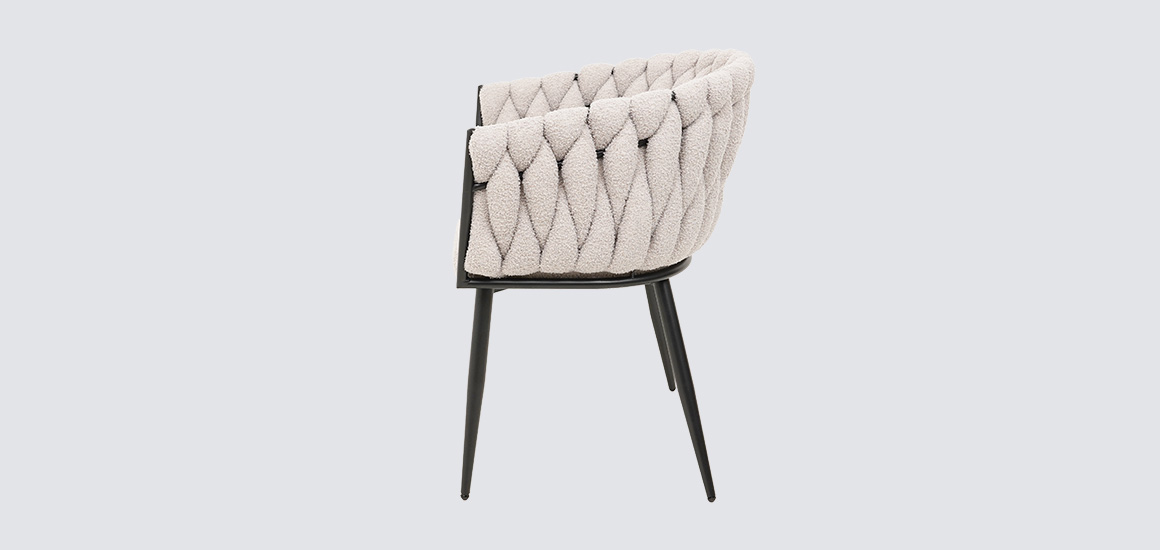 Дизайнерское кресло Джоли отличается замысловатым переплетением ткани в спинке, плавно переходящей в подлокотник.