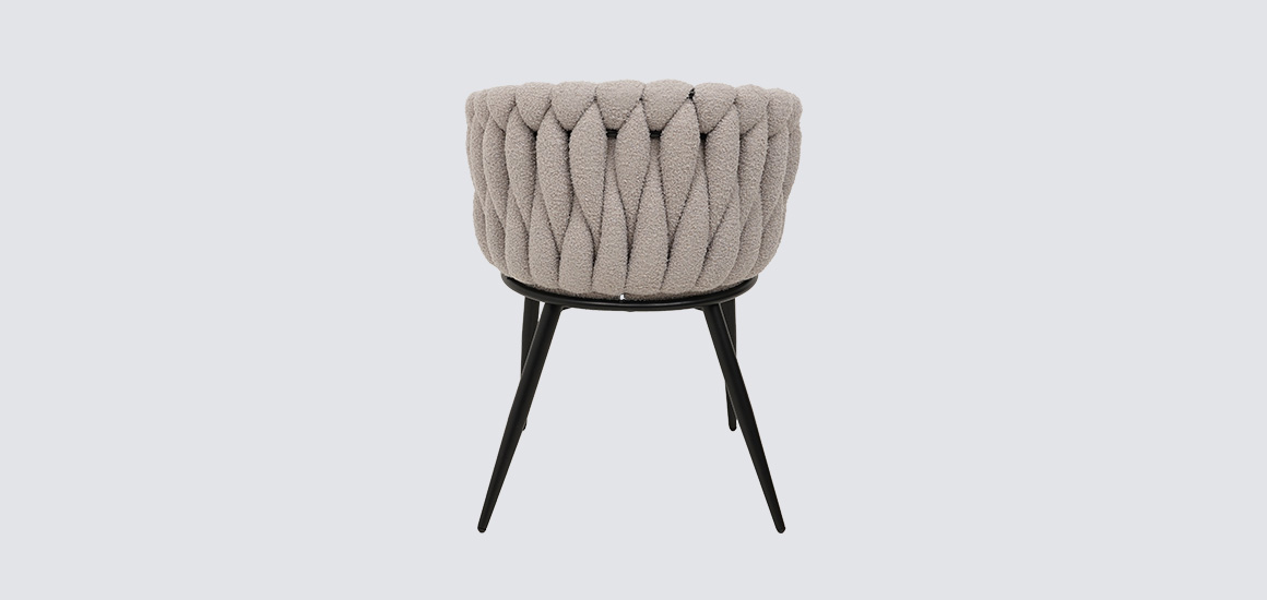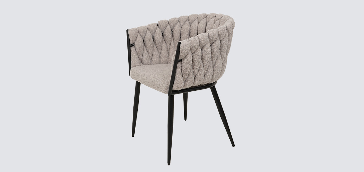 Дизайнерское кресло Джоли отличается замысловатым переплетением ткани в спинке, плавно переходящей в подлокотник.