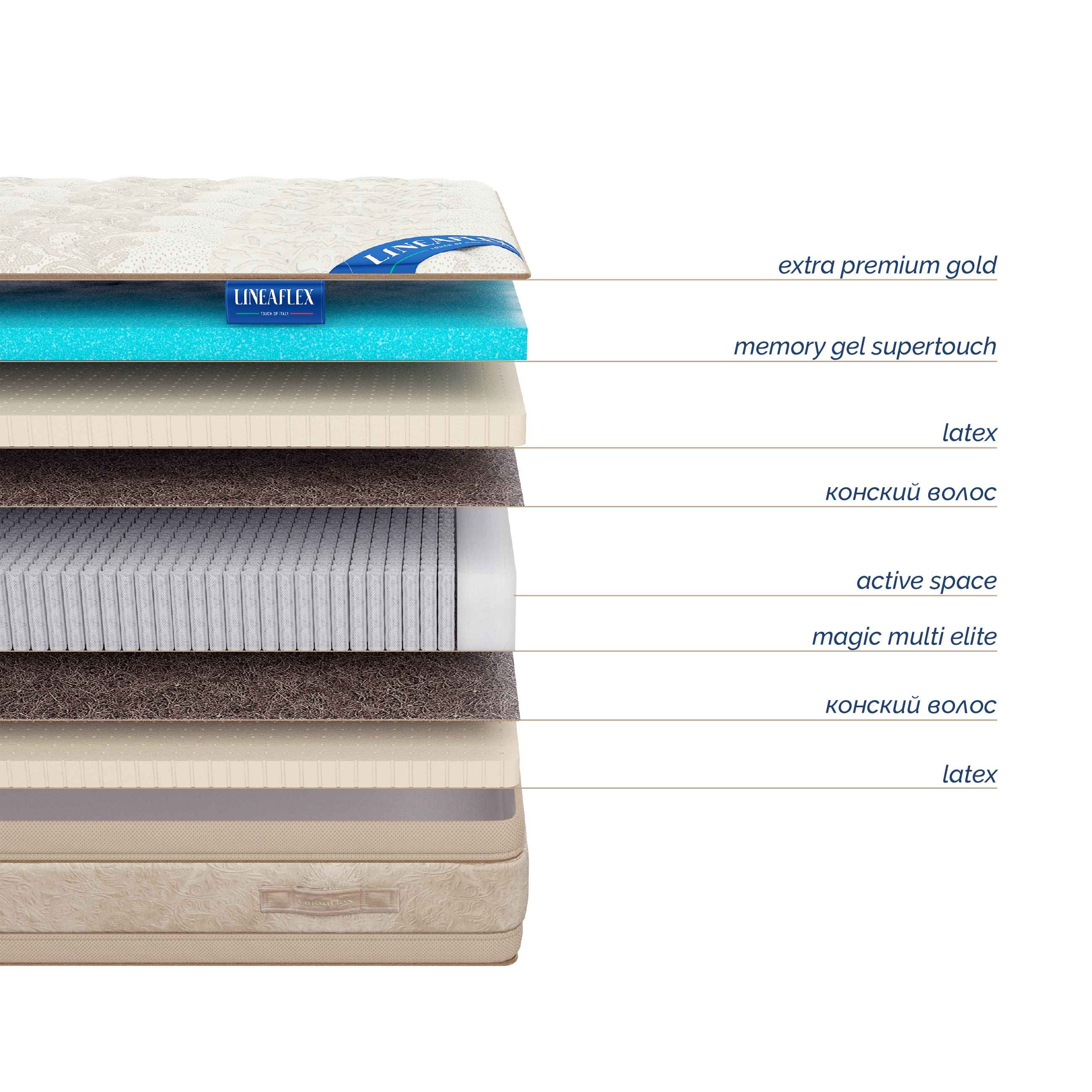 ↑ чехол Extra Premium Gold – итальянский трикотаж с нитями вискозы + гипоаллергенный наполнитель Skyfiber + пена Ergoflex Touch.↑ Memory GEL Supertouch