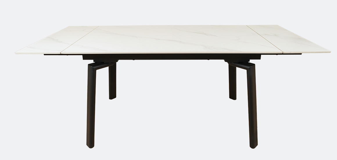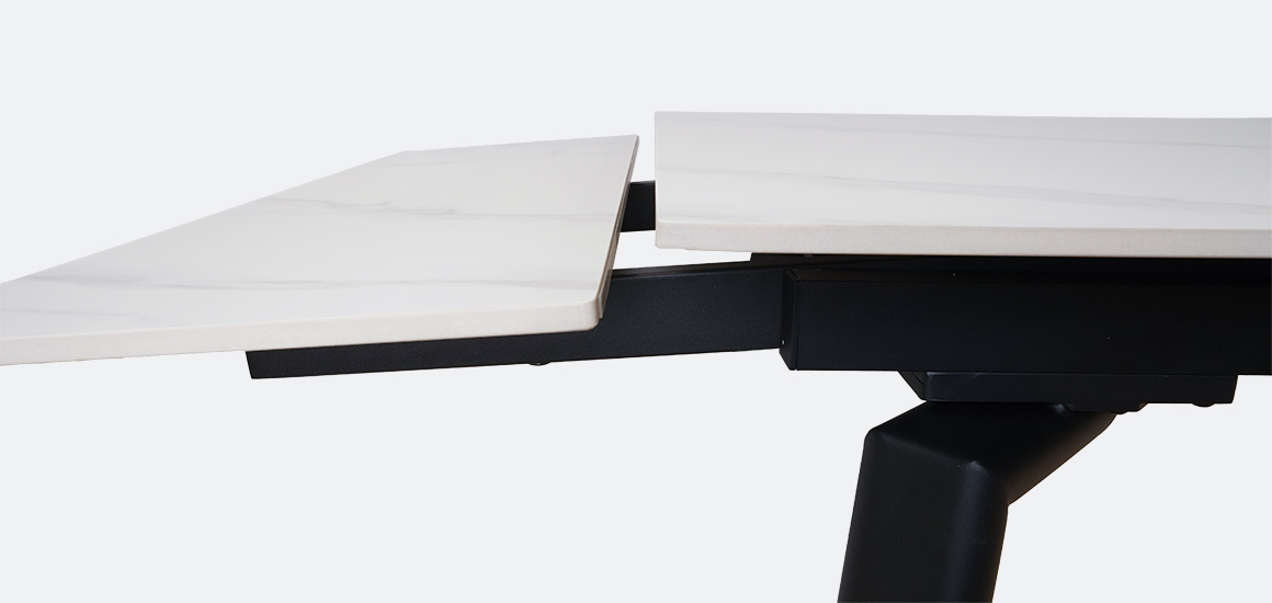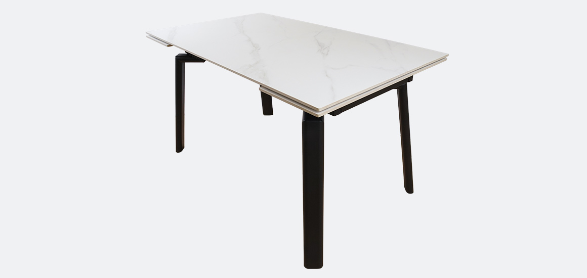 Обеденный раскладной стол Комо. Столешница выполнена из синтезированного камня - устойчивый, прочный и экологичный материал. Чуть закруглённые углы и белая матовая столешница - беспроигрышный вариант для любой гостиной. По бокам стола расположены дополнительные раздвижные элементы, которые увеличивают полезную площадь столешницы на 30 или 60 см в длину.