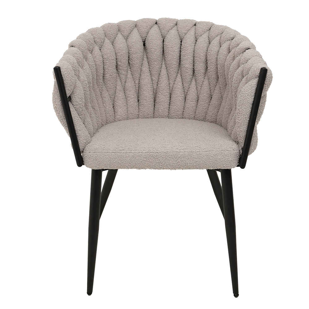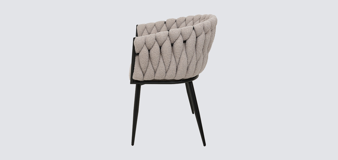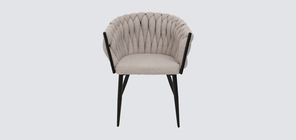 Дизайнерское кресло Джоли отличается замысловатым переплетением ткани в спинке, плавно переходящей в подлокотник.